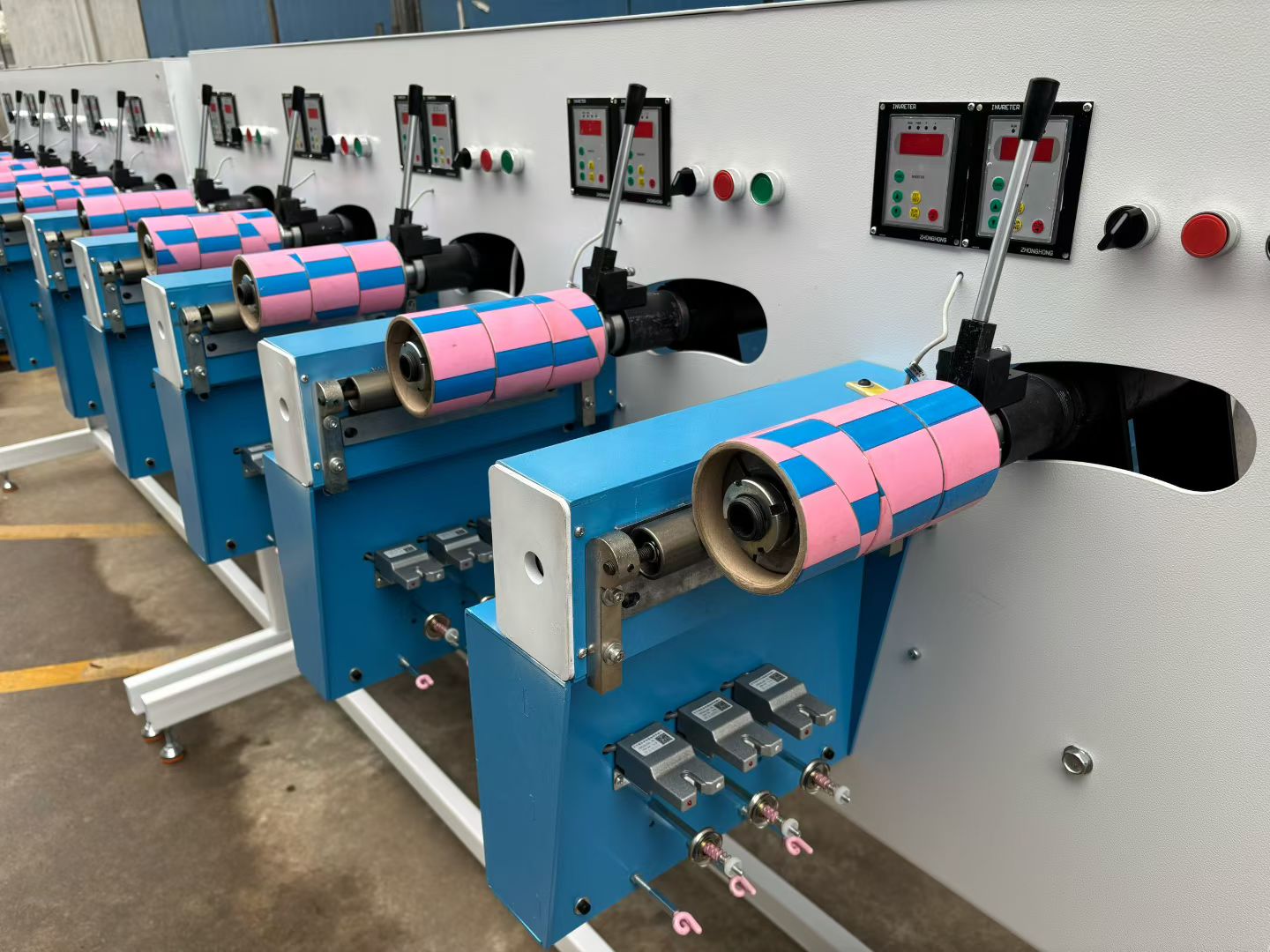 倒筒机是纺织行业的专用设备,核心作用就是把大卷的原纱,重新倒卷成规格统一、张力均匀的小筒纱(比如缝纫线筒、绣花线筒) 多头工位设计:图里的 8 个蓝色单元,每个都是独立的倒筒工位,可同时加工 8 个筒纱,是倒筒机最典型的多头配置。 卷绕部件:每个单元前端的粉色部件,就是纱线筒管,用来完成纱线的精密卷绕。设备功能:这类设备通常支持自动排线、张力控制、计米 / 计数、断线自停,是缝纫线、绣花线、工业纱线生产中必不可少的工序设备。